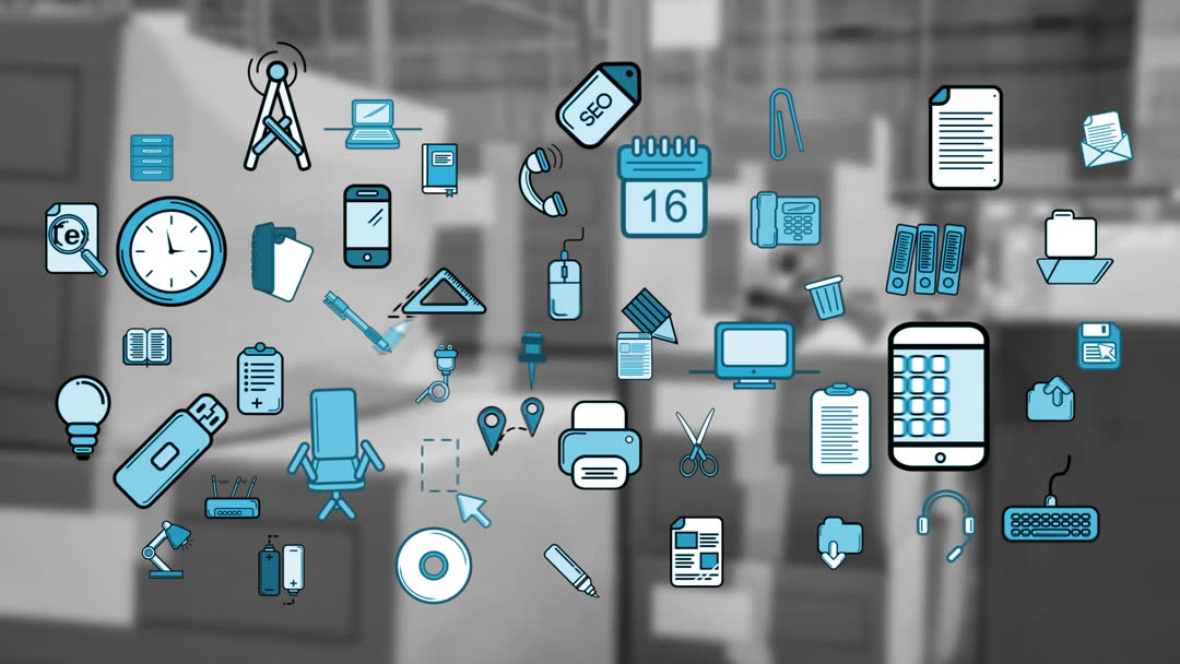 Digitally Rendered Office and Shipping Icons Overlay in Warehouse Video