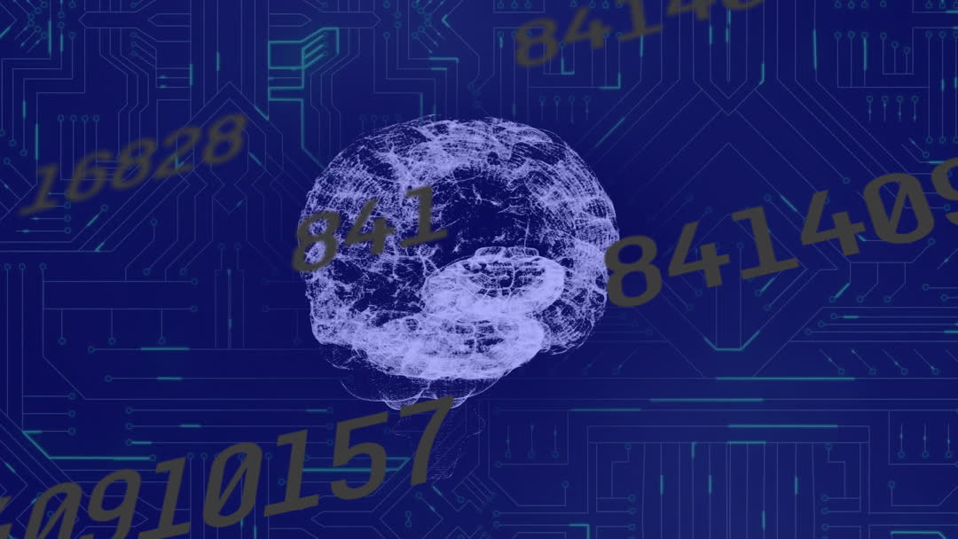 This video features an artistic representation of a brain with a digital circuit board as the backdrop. Overlaid numbers suggest data processing or computational activities. Utilize this in contexts like technology discussions, AI development, digital transformation themes, or cognitive computing presentations.