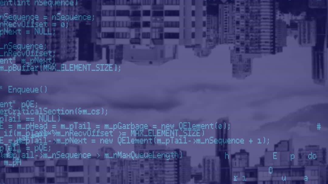 Animated depiction of code projected over an urban cityscape, illustrating the intersection of technology and urban development. Ideal for use in presentations or content related to urban planning, digital technology, and global business innovations.