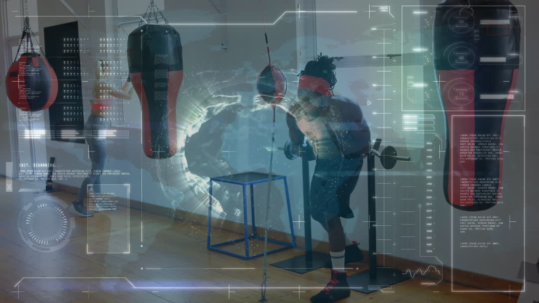 Boxers practicing in gym represented through digital holographic interface concept. Can be used for illustrating the integration of technology in sports fitness training, data analytics in athlete performance improvement, or innovative tech in sports. Suitable for blogs, sports tech presentations, or fitness technology articles.