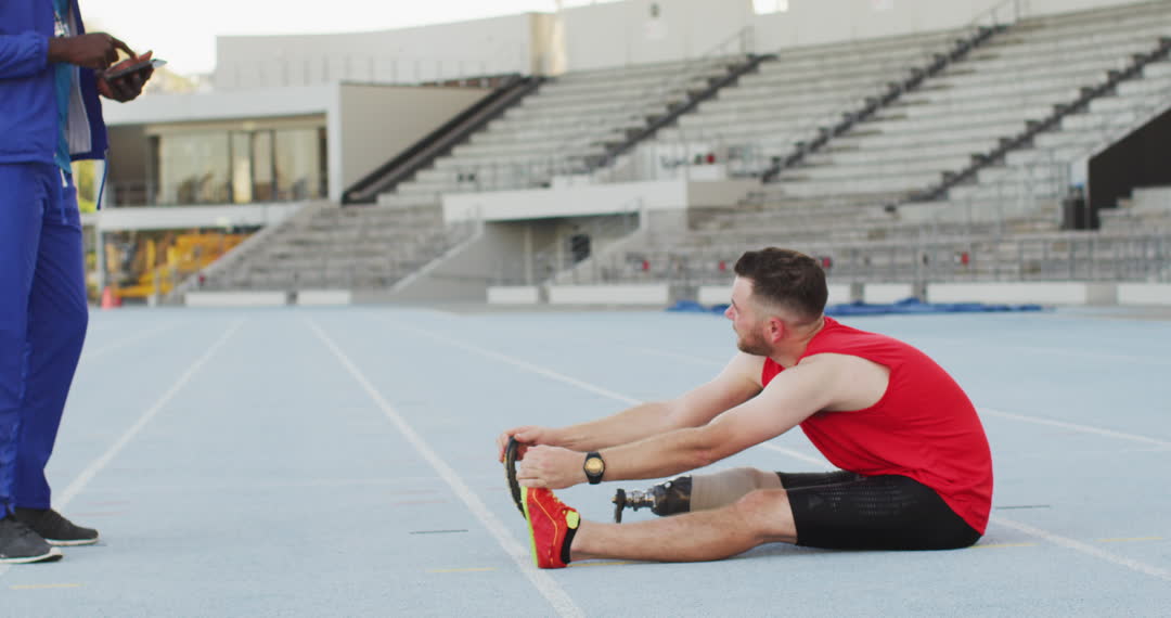 Disabled Athlete with Blade Prosthetic Stretching with Coach Video
