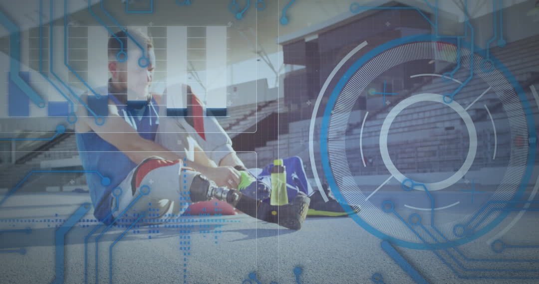 The visual shows a disabled athlete adjusting their prosthetic leg in an outdoor athletic venue. Digital interface graphics overlap, suggesting themes of sports technology, innovation, and data analysis. Useful for illustrating future trends in adaptive sports, advancements in technology for disabilities, or modern sports data analytics.