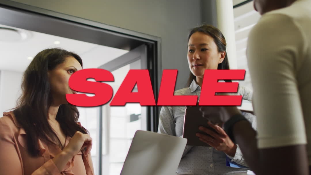 Animation features sale text overlay on a diverse group of business professionals engaged in discussion. Ideal for illustrating business promotions, sales strategies, and team collaboration. Suitable for use in marketing campaigns or business presentations highlighting discounts or special deals.