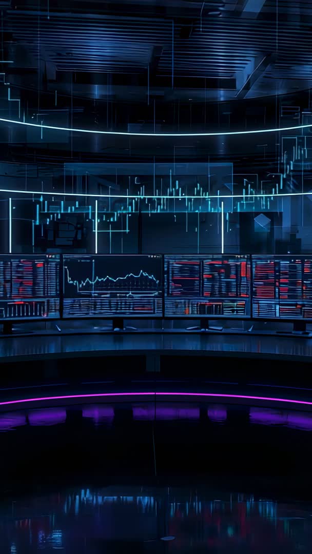 AI Generated Image. Scene showing futuristic control room with curved multi-screen dashboard and animated data streams. Monitors displaying real-time charts, candlestick patterns, and performance metrics while pulsing LED accents and neon reflections creating cyberpunk aesthetic. Vertical composition optimizing mobile and social playback, ideal for tech demos, finance apps, trading tutorials, broadcast backgrounds, corporate presentations, pitch decks, and website hero sections. Working well for promoting analytics software, fintech branding, market reports, cyber security campaigns, or live stream overlays and lower thirds. Color palette featuring deep blues and magenta providing dramatic contrast. Loop friendly for seamless vertical playback and easy integration into video edit timelines.