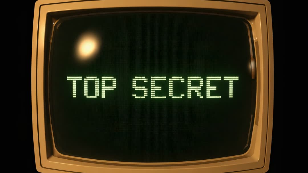AI Generated Image. Featuring green dot-matrix 'TOP SECRET' text holding on vintage CRT monitor, framed by warm beige bezel and soft studio glare. Evoking retro computer, Cold War, spy thriller, cybersecurity, classified documents themes. Working well for title sequences, film or documentary b-roll, promotional clips, social media teasers, cybersecurity presentations, podcast covers and thriller trailers. Allowing easy color grading and text overlay for branding or headline insertion. Supplying high-contrast dark background for seamless lower-third graphics and motion graphics. Matching vintage tech, nostalgia, secrecy and surveillance narratives for editorial, marketing and entertainment projects.