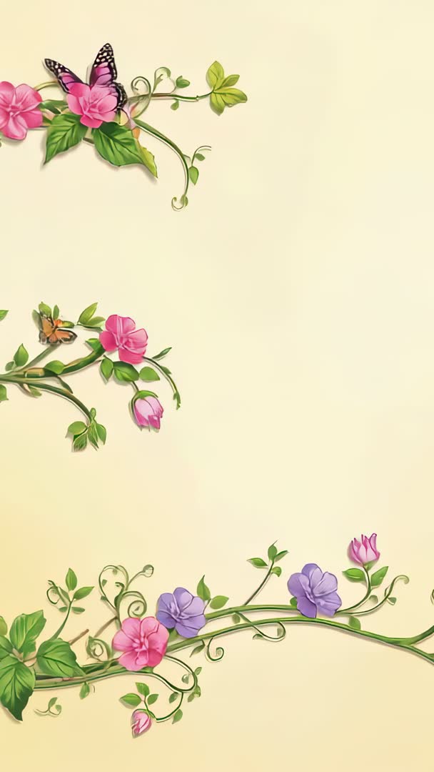 AI Generated Image. Showing delicate green vines winding with pink and purple blooms and butterflies over soft cream canvas, created as vertical video loop. Composing generous negative space for overlaying text, logos, or animated titles. Suited for social media stories, mobile wallpapers, vertical website headers, wedding invitation animations, greeting card reels, seasonal promotions, floral brand identity, spa and wellness content. Offering elegant, romantic mood with pastel palette and ornamental border elements, working well for title cards, lower-thirds, product showcases, and animated transitions. Delivering high-resolution, loop-friendly footage for seamless background use and easy editing in video projects.