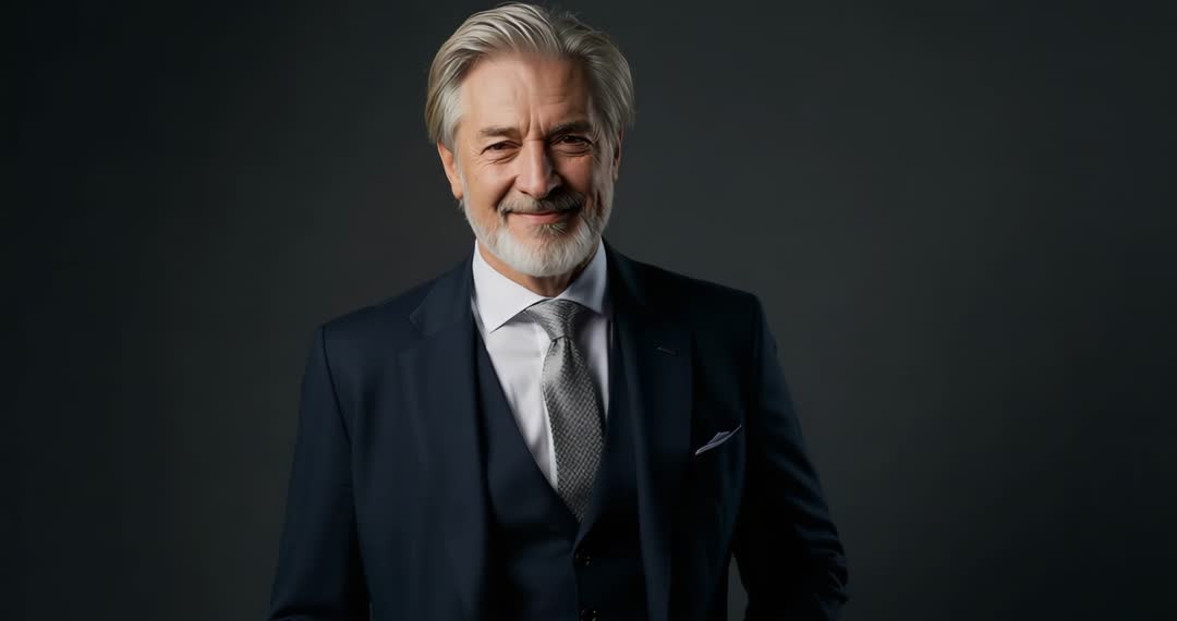 - Distinguished Senior Businessman in Formal Suit Smiling on Grey Background