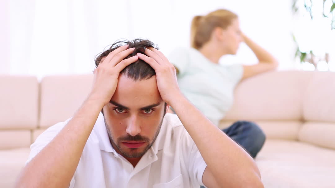 Man appears stressed, sitting on couch while woman is turned away, conveying concept of relationship problems or emotional frustration. Suitable for articles about relationship struggles, mental health awareness, or life challenges.