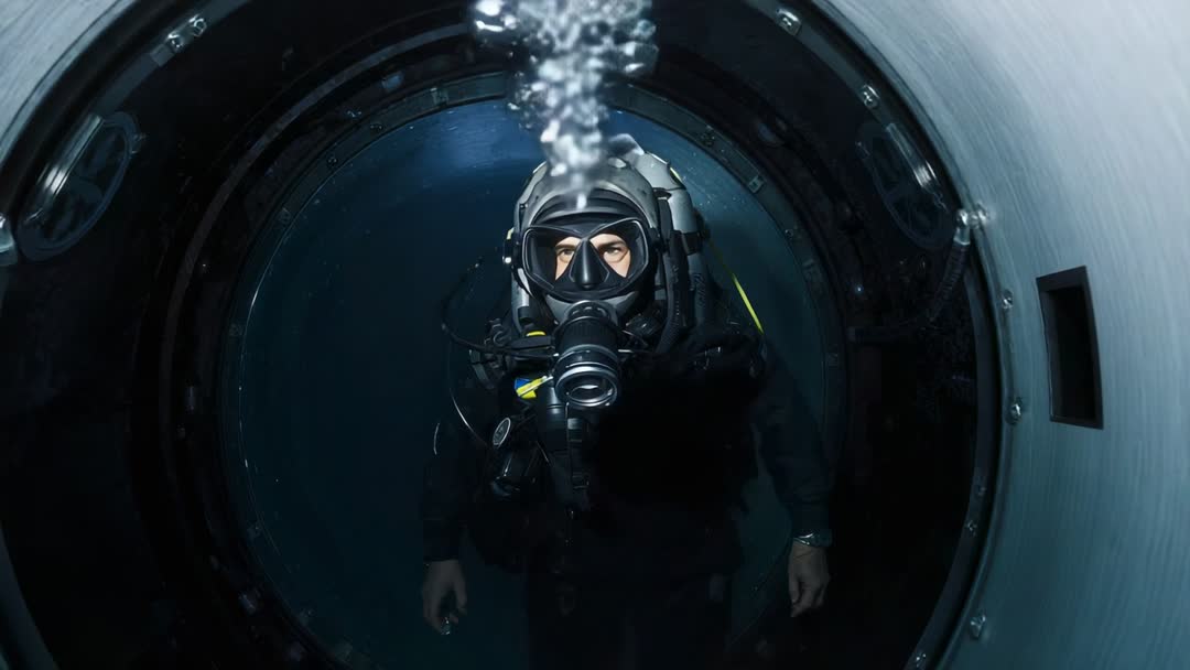 AI Generated Image. Showing professional diver wearing full face mask and regulator, exhaling steady bubble trail while floating inside round metal hatch of underwater training tank. Featuring close-up through porthole with dramatic low-light tones, metallic rim reflections, and deep blue water background. Suitable for use in diving training videos, safety briefing materials, commercial diving demonstrations, and military or industrial diving presentations. Working well as cinematic opener for documentaries, promotional content for dive schools, background footage for websites, social media ads, and technical manuals. Allowing editors to use for slow-motion sequences, title overlays, or color-grading to achieve moody cinematic look.