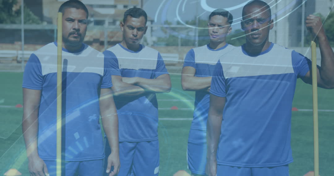 Group of athletes standing confidently on soccer field, overlaid with digital graphics symbols and global themes. Perfect for illustrating teamwork, modern sports dynamics, international events, or tech-infused fitness narratives.