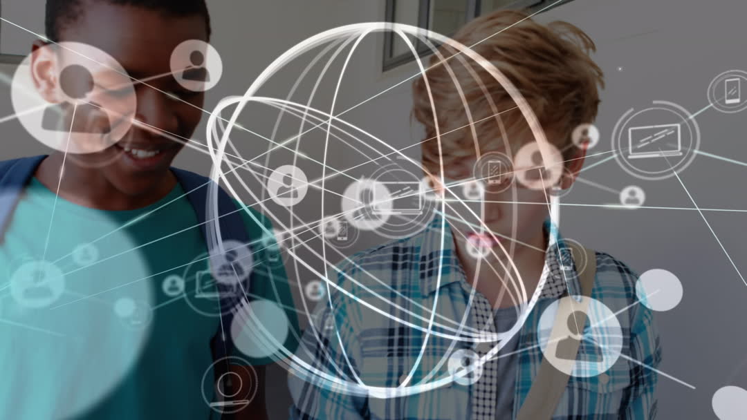 Two diverse boys talking in a school environment with animated digital connections overlaying the scene, representing the concept of education enhanced by technology. Suitable for topics on modern learning, digital skills development, educational innovations, and communication. Great for use in educational blogs, tech-savvy school programs, or global communication themes.