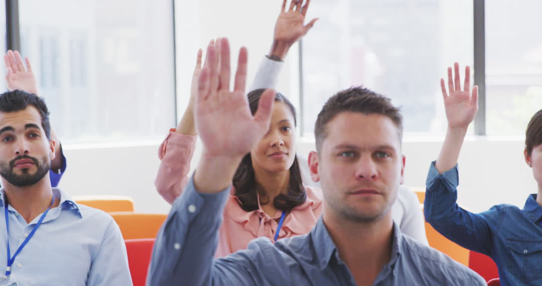 Business professionals actively participating in a conference setting by raising their hands for questions or expressions. Ideal for depicting corporate culture, team meetings, employee engagement, diversity in the workplace, educational sessions, and professional networking events. Perfect for use in business, educational, or motivational contexts.