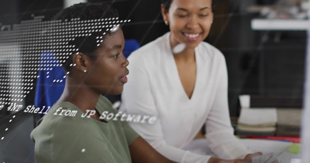 Two diverse female colleagues are in a lively discussion in a modern office. Overlays of data processing and a world map underscore the themes of technology and international business. Suitable for use in corporate presentations, articles on global business, and materials promoting workplace diversity and digital innovation.
