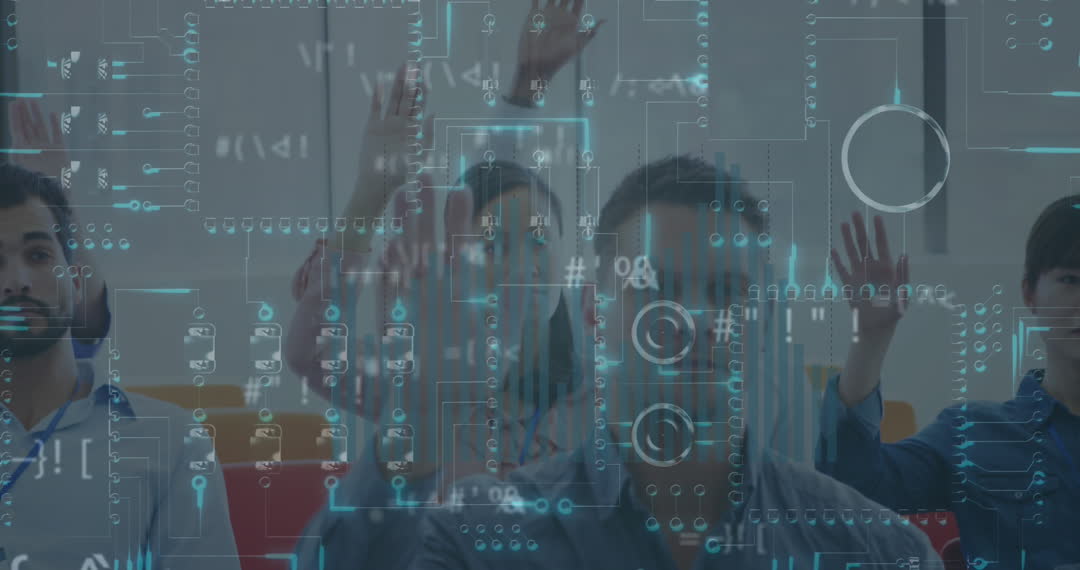 Captured in a business conference, diverse individuals actively engage, symbolizing international connections and data sharing. Useful for illustrating technological advancement in global business, networking potential, and audience interaction in seminars and conferences.