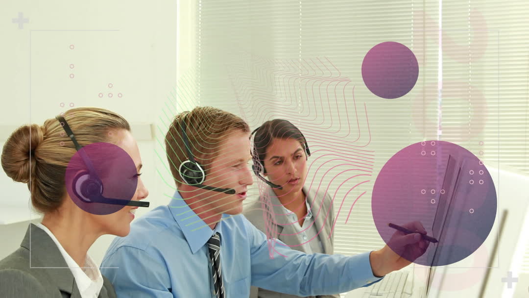 Business consultants using headsets and computers collaborate in modern office environment. Purple geometric shapes enhance setting by adding dynamic and futuristic digital touch. Suitable for promoting teamwork, professional services, innovation, and technology in business contexts, ideal for blog posts, corporate presentations, and technology solutions videory.