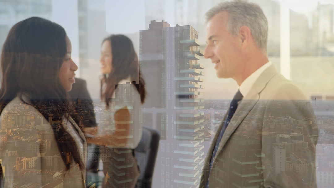 Diverse Business Executives Shaking Hands with Cityscape Overlay Video
