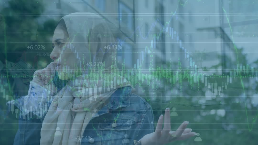Scene depicts a young businesswoman wearing a hijab during a business meeting. Digital animations of financial data are overlayed, symbolizing modern financial strategies and global economic challenges. Can be used for topics related to diversity in business, the impact of the pandemic on financial markets, and technological evolution in finance.