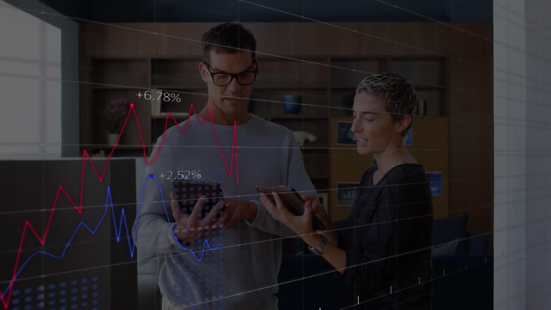 Two professionals studying financial data trends displayed on digital graphs. Scene represents teamwork and digital analysis, perfect for illustrating modern business strategies, financial growth, and collaborative environment in corporate settings.