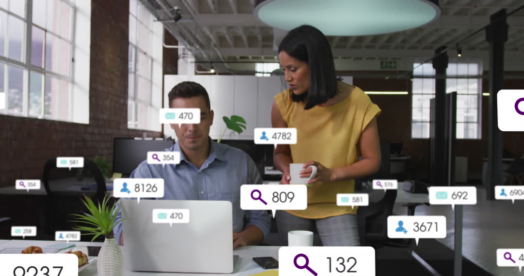 Diverse business professionals in modern office bending over laptop display animated social media data interacting with business settings. Useful for illustrating concepts of data integration in digital marketing, trends in collaborative work environments, or case studies on using social media analytics in corporate strategy.