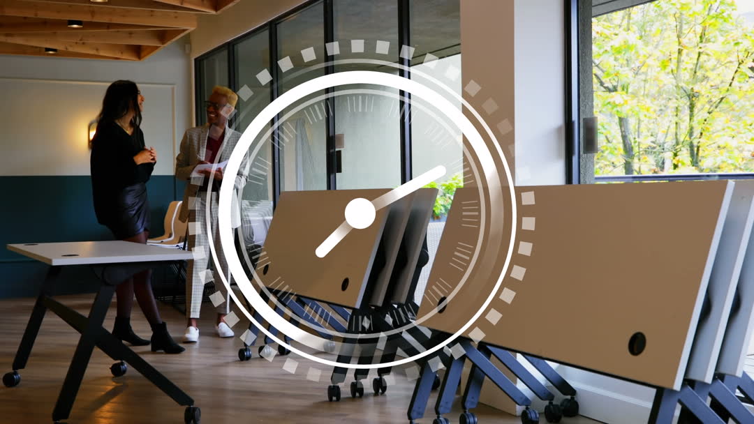 Workers discussing project in modern office space, captured through animation of time overlay, conceptualizing efficient time management strategy in dynamic workplace. Suitable for illustrating globalization concept in business, time-oriented team projects, or promotional content for efficiency and productivity services.