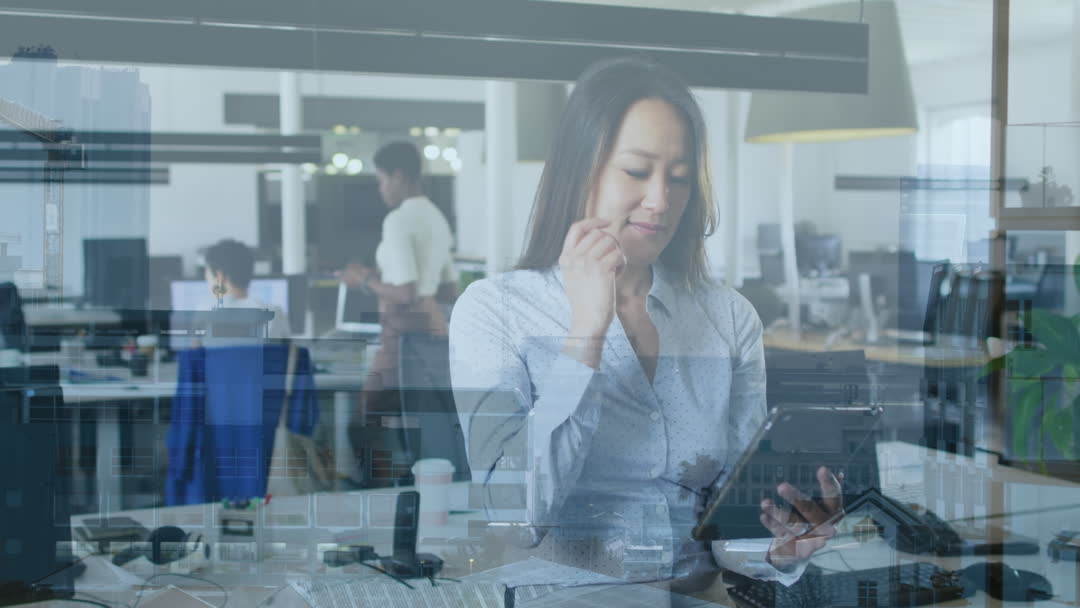 Businesswoman interacting with tablet in modern office environment with digital city overlay suggesting global connectivity and innovation. Ideal for concepts related to diverse business teams, digital technology, futurism, urban workplaces, global networking, enterprise solutions.