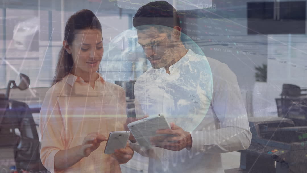 Two business professionals, a man and a woman, using tablets for data analysis. Illustrates global business connectivity with digital data visuals. Ideal for themes of technology integration, teamwork, diversity in the workplace, and digital advancements in business strategies.
