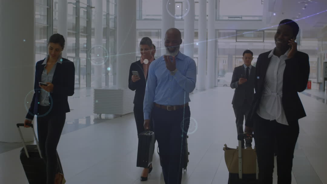 Group of diverse business professionals walking through a modern office corridor, featuring digital connection overlays symbolizing data processing and global networking. Ideal for illustrating corporate teamwork, leadership, innovation, technology integration in business environments, or global connectivity themes.