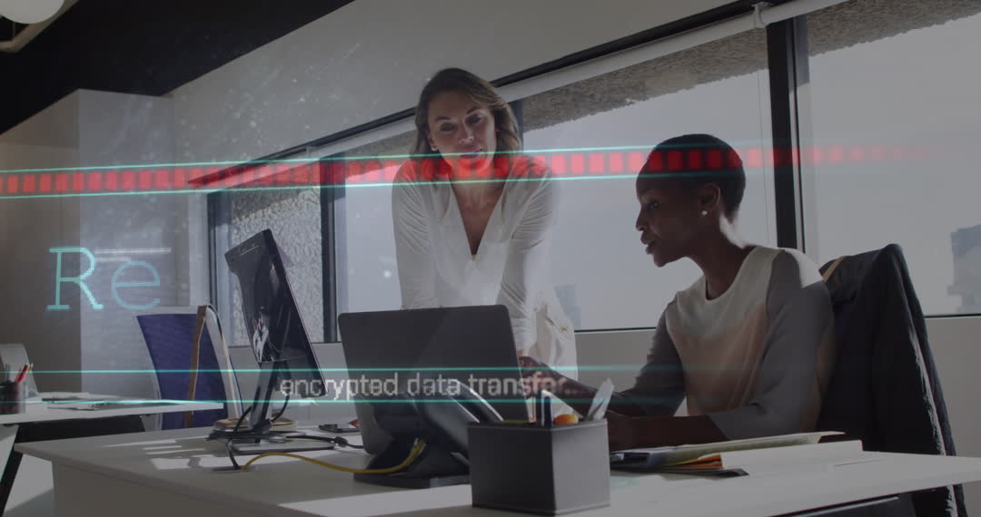 Two diverse business professionals collaborate in an office while digital elements suggest encrypted data transfer. Ideal for illustrating themes of digital business solutions, secure data management, and teamwork in modern office environments.