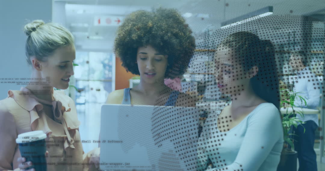 Diverse group of businesswomen collaborating on data analysis using digital technology in a modern office setting. They are engaged with code and information represented through dynamic digital screens, symbolizing teamwork, innovation, and the integration of technology in business problem-solving. Ideal for promoting business solutions, teamwork culture, diversity in the workplace, and modern technology utilisation.