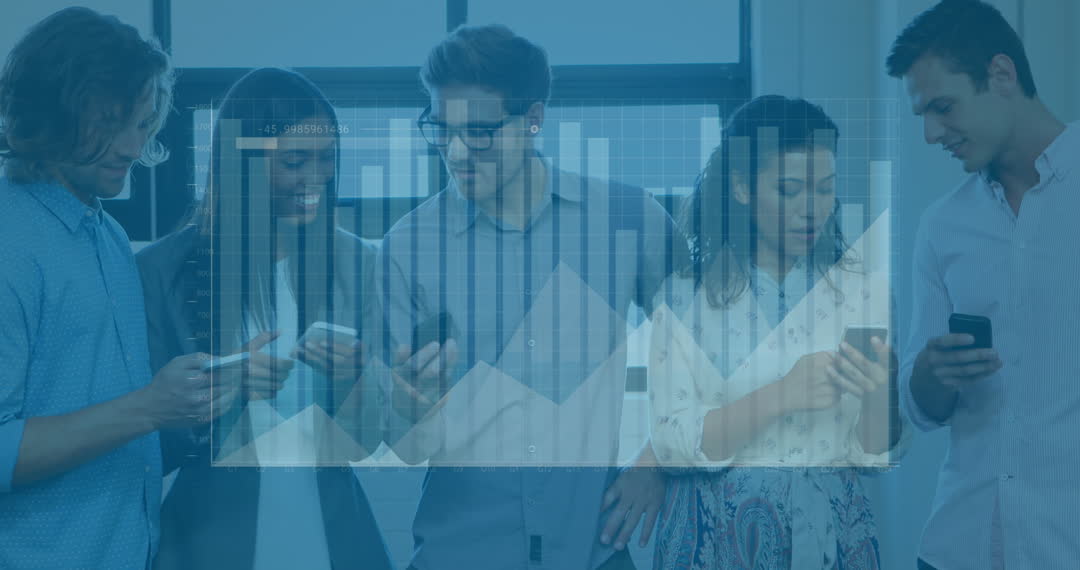 Diverse group of business professionals standing together in office analyzing data displayed on smartphones. Graph overlays emphasize data-driven decision making and modern technology integration in workspaces. Great for illustrating collaboration, technology trends in business environments, and data analytics engagement.
