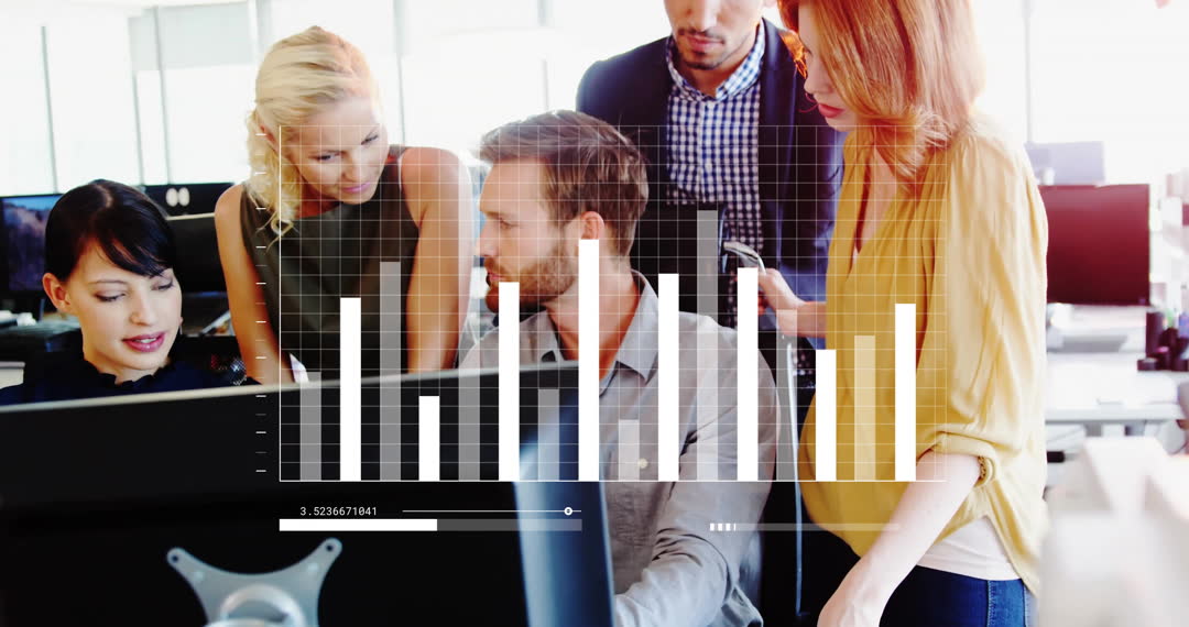 A diverse business team collaboratively analyzing information on a computer screen, with overlaying graphs representing data processing. Ideal for depicting teamwork, data analysis, or digital technology themes in corporate promotional materials, business presentations, or educational content about data-driven decision-making.