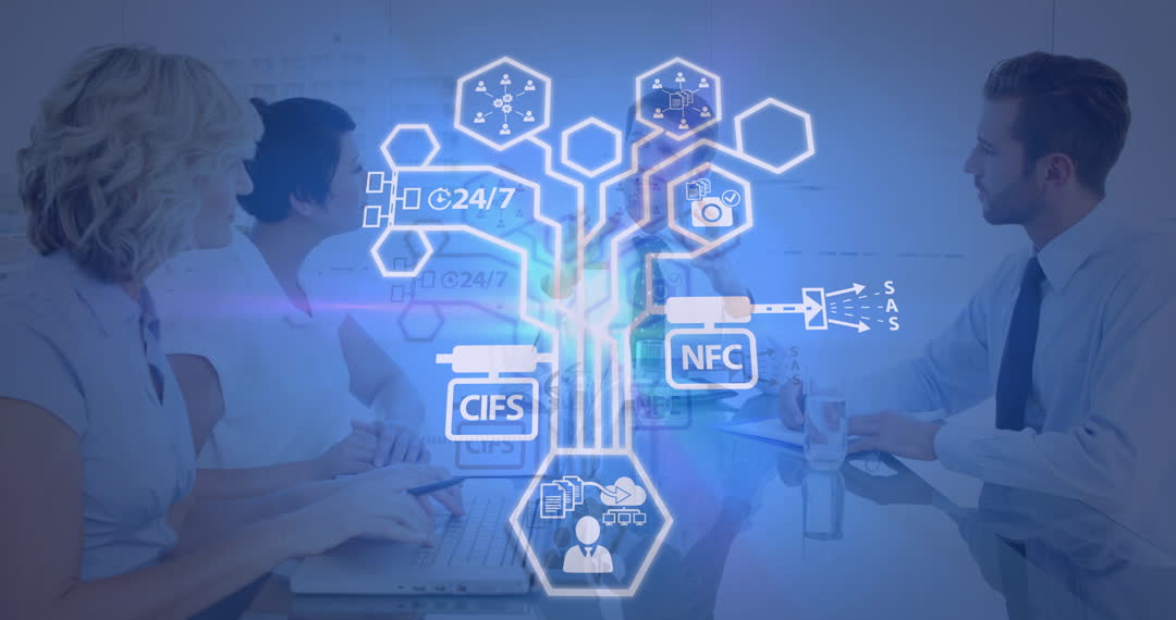 Depicts a group of diverse business professionals discussing digital network and data integration in a modern workspace. The animation overlays of NFC and CIFS icons suggest a strong emphasis on technology and digital communication. Ideal for illustrating modern business practices, diversity in tech-driven environments, or corporate strategy development. Useful for presentations, reports on technology trends, or promotional materials for networking services.