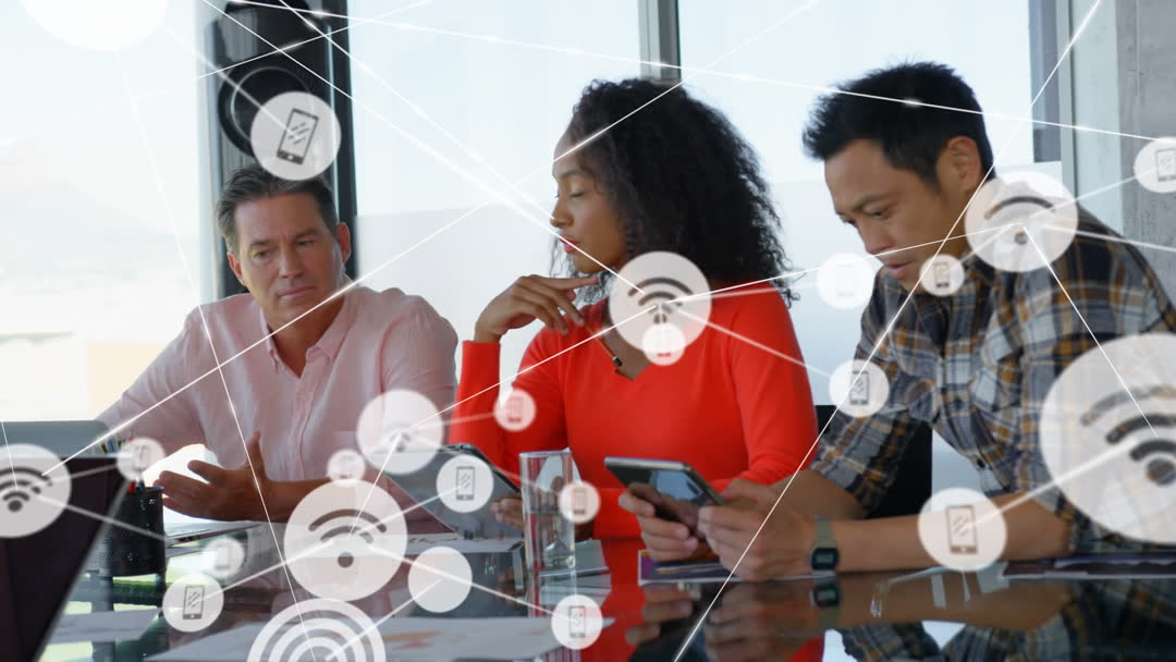 A multi-ethnic team discussing strategies during an office meeting, illustrating a network of connections through digital overlays and WiFi symbols. Ideal for depicting themes of global communication, teamwork, technological collaboration, or internet connectivity in a modern work environment.