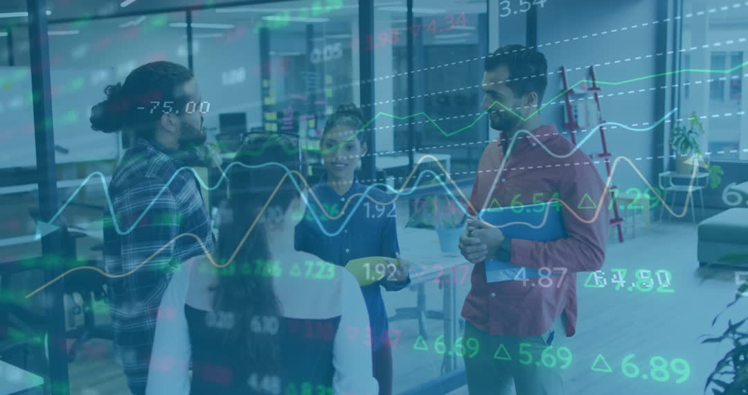 Business professionals discussing ideas with digital financial graphs overlay signifying real-time data analysis in a modern collaborative office. The setting is ideal for illustrating global connections and strategies or financial tech solutions in business teamwork. Perfect for use in articles relating to financial displays, business meetings, technology advances in finance, and corporate environments.