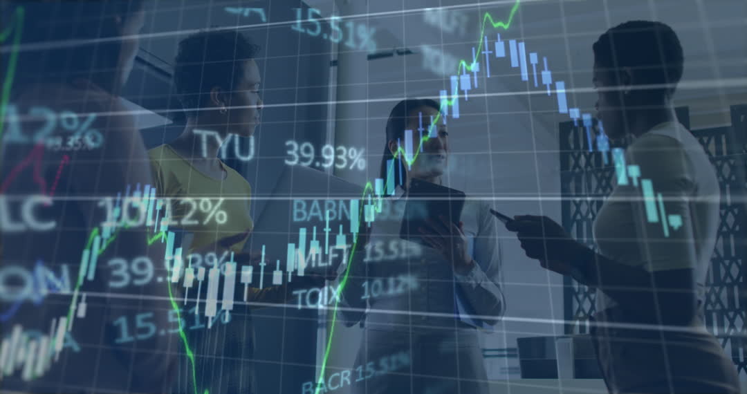 Business team composed of diverse individuals collaborating in an office, overlaid with financial charts and graphs. Depicts analysis and discussion of market trends and financial data. Effective for representing economic themes, digital transformation, teamwork in finance, and business strategy presentations.