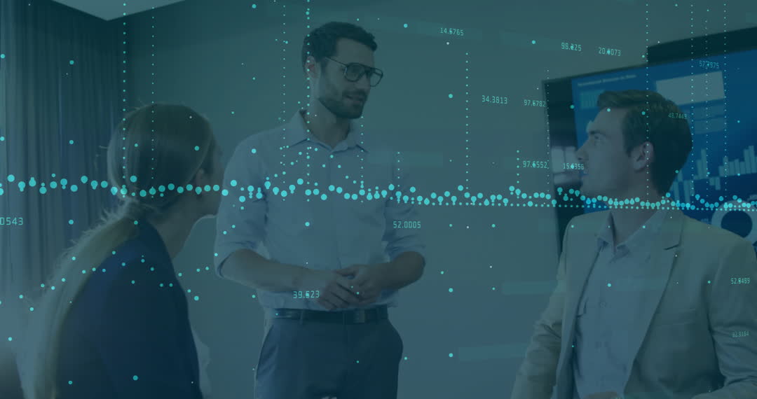 An animated overlay of digital financial data floats over diverse business professionals gathered around an office space, engaging in discussion or planning. Use in presentations to visualize modern financial analysis trends, corporate strategy discussions, or to emphasize collaborative financial planning with an advanced, digital edge.