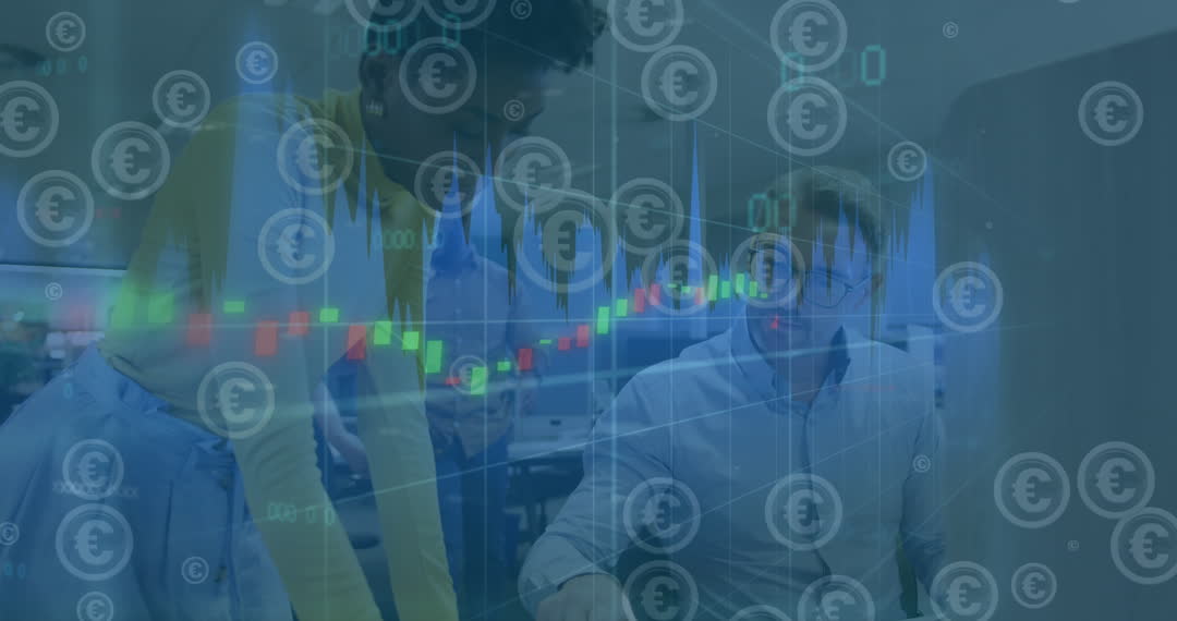 Diverse group of professionals working together in office setting, reviewing and analyzing financial data with overlay of euro currency symbols and stock market charts. Ideal for illustrating concepts of global business, teamwork, and digital economy trends. Can be used in articles or blogs about businesses adapting to technological advances, financial market updates, or diverse team dynamics.