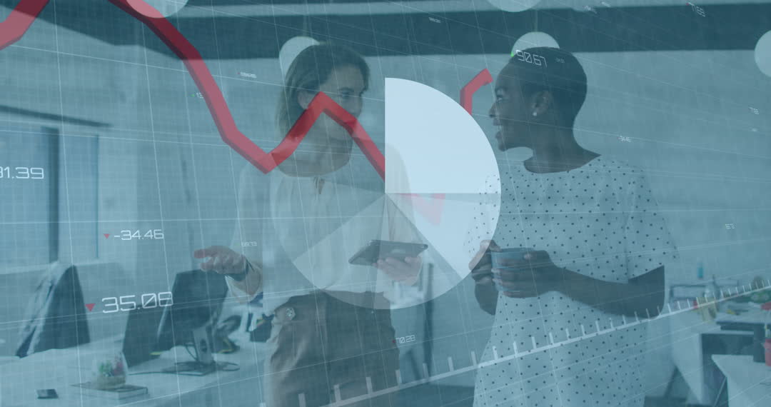Image depicts diverse business team discussing financial performance data in a modern office setting, featuring overlay of graphs and charts. Ideal for use in articles or presentations on teamwork, financial analysis, modern business practices, or the impact of technology in corporate environments.