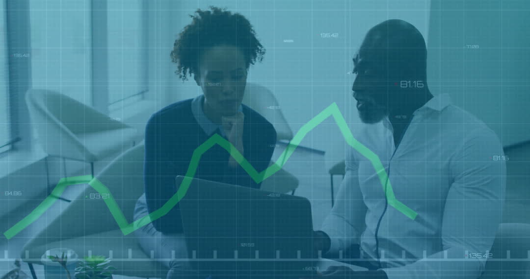 Two diverse business professionals collaborate over a laptop in a modern office, analyzing financial data represented by digital graphs. This video emphasizes teamwork and technology in the business world, making it ideal for articles on financial strategies, business collaboration, or technology in the workplace.