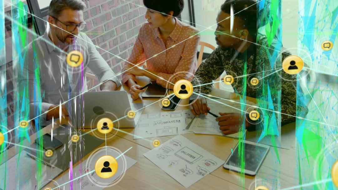 Three professionals from a diverse team discuss network data over laptops and paperwork, accompanied by an animated network of digital connections overlay. Suitable for illustrating modern business communication, teamwork in digital environments, and innovative technology use in workspaces. Ideal for videory illustrating global business practices, technology integration, or digital strategy discussions.