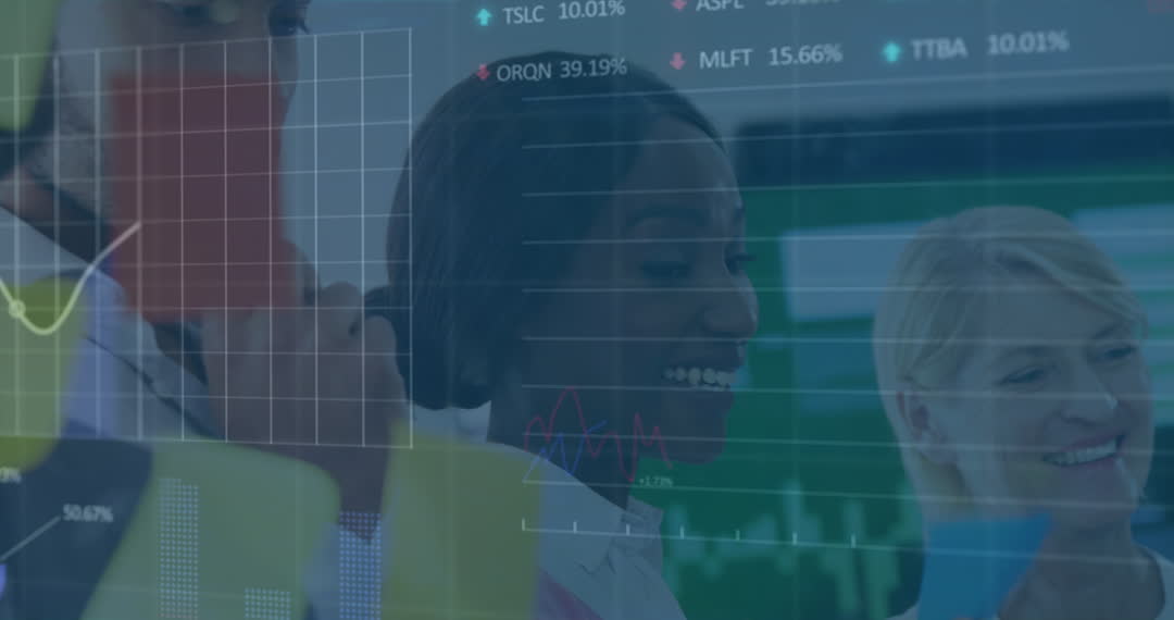 This video features a diverse business team engaged in analyzing stock market data within an office environment. Graphs and financial data overlay suggest focus on technology-driven analysis. Useful for illustrating teamwork in corporate finance, digital transformation in business strategy, or diversity in the professional workspace.