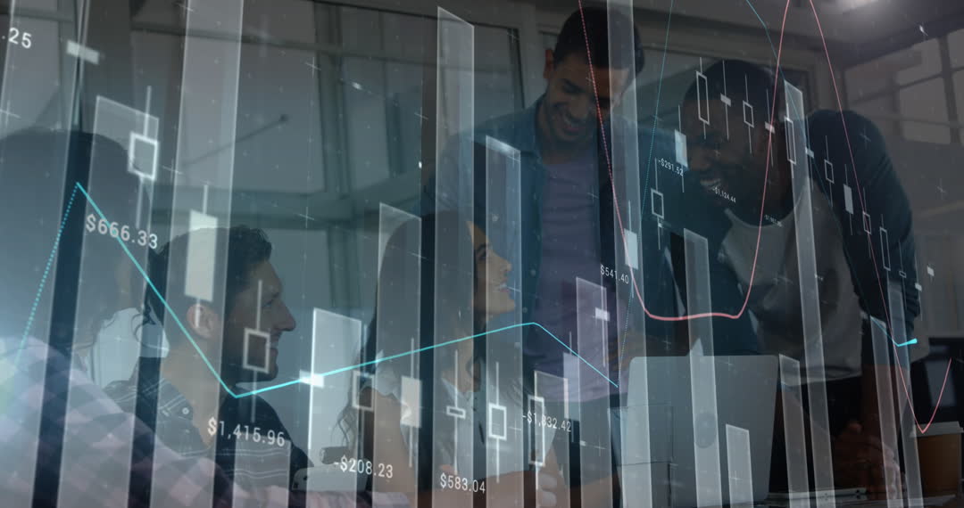 This video depicts a diverse business team engaged in reviewing data on stock market charts and graphs. It combines real-life teamwork and digital visualizations, integrating financial analytics into daily business practices. Ideal for use in media related to finance, stock market analysis, team collaboration, diversity in business, or digital transformation initiatives.