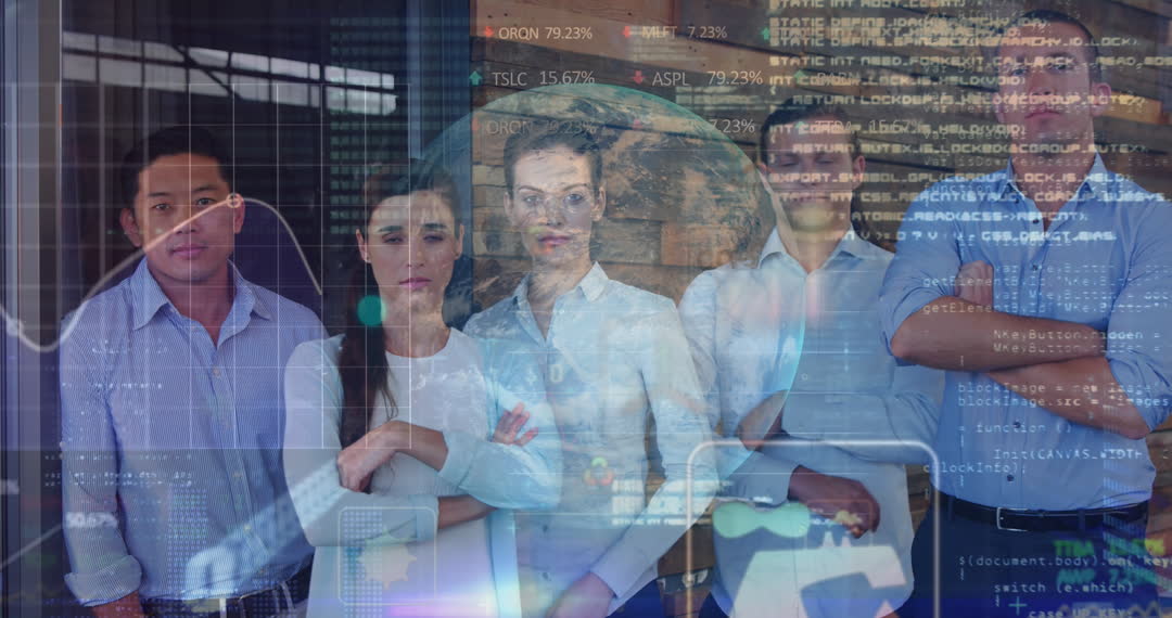 Diverse business professionals standing confidently overlaid with digital data graphics. Represents integration of technology and teamwork in modern business environments. Ideal for illustrating themes of innovation, digital transformation, data analytics, and corporate leadership in presentations or marketing materials focused on business technology strategies.