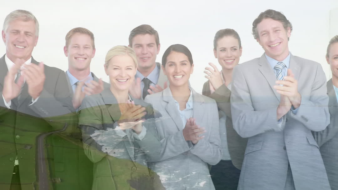 Professionals in formal attire clap and smile, showcasing joy or achievement. Overlaid world map and digital graphics highlight global technology theme. Useful for marketing materials about business success, team spirit, digital innovation, or global connections.