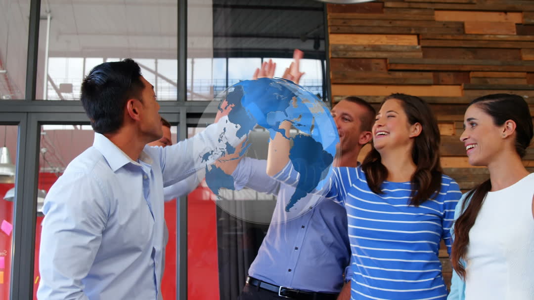 Diverse Business Team Celebrating Success with Global Interface Overlay Video