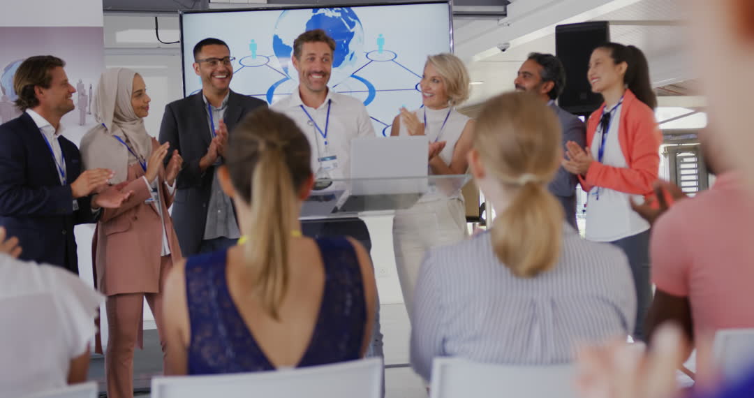 Professionals gathered and applauding in a conference setting. Ideal for content related to business leadership, team success, public speaking tips, and corporate events. Suitable for promoting diversity and collaboration in business environments.