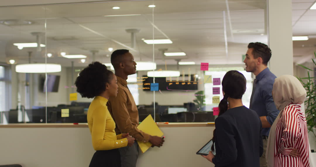 A diverse group of business professionals collaborately working on a brainstorming session in a modern office environment. They are engaged in discussion while standing around a glass board with sticky notes, displaying effective teamwork and creative thinking. This can be used in materials highlighting collaborative teamwork, modern corporate culture, office planning sessions, or presentations on business innovation strategies.