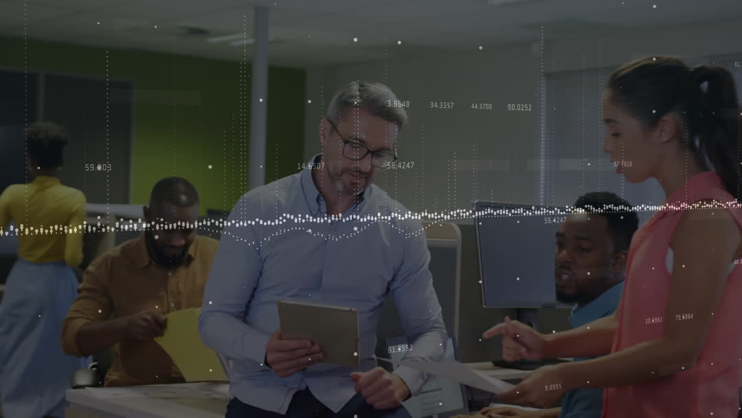 Diverse Business Team Collaborating with Financial Data Overlay Video