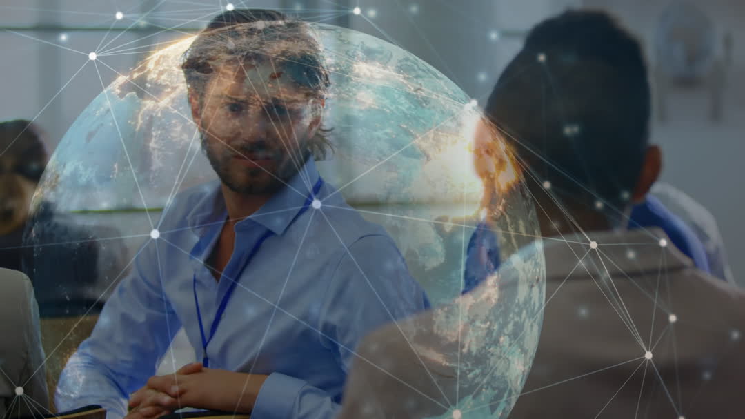 This video illustrates a diverse business team collaborating, with an overlay of a digital globe, symbolizing global connectivity and technology's impact on professional environments. Suitable for concepts of globalization, international communication, modern business practices, or the use of technology in teamwork dynamics.