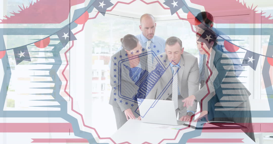 Image features a diverse team of business professionals discussing over a laptop with a stylized USA flag superimposed. Ideal for conveying concepts of teamwork, patriotism, or American business environment in corporate presentations, marketing materials, or social media campaigns reflecting national themes.